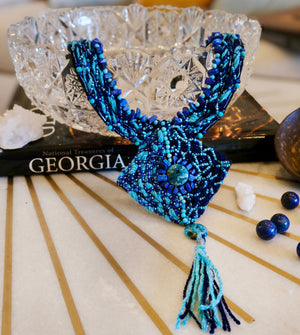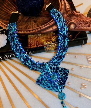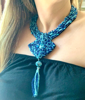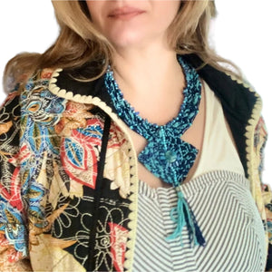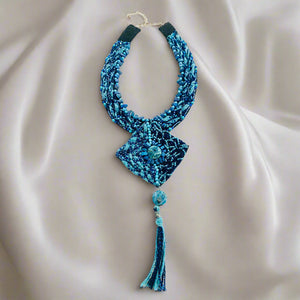 Inspired by serene beauty of ocean tides, this necklace captures the rhythm of nature in a bold geometric form. At its heart lies Lace Agate focal stone, framed in a striking rhombus shaped centerpiece that symbolizes harmony and balance. Surrounding it are Howlite chips and vibrant Turquoise accents, echoing the hues of tranquil seas. Soft blue yarn flows through the design like currents, while the  tassel adds graceful movement, mirroring the ebb and flow of the tides.