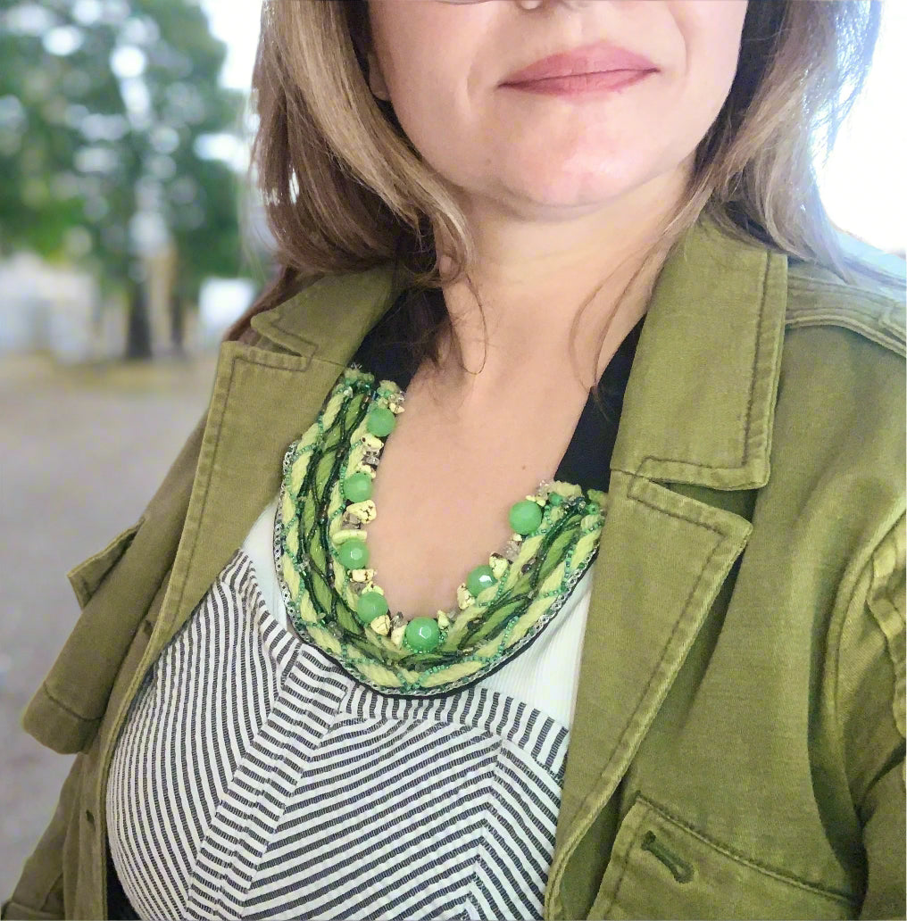 I am sure you have seen a Romanesco crisp green cauliflower with geometric spirals like a sacred mandala, it’s a visual wonder. With that image and inspiration in mind, I reached for green Chalcedony, known for it’s calming energy and layered it with Citron Magnesite and clear Quartz for clarity and vibrance. Unlike my more colorful pieces, I stayed true to shades of green to speak to itself. I just added a silver trim to bring luminosity, like a quiet shimmer of light. The adjustable ribbon adds both comfort and contrast.