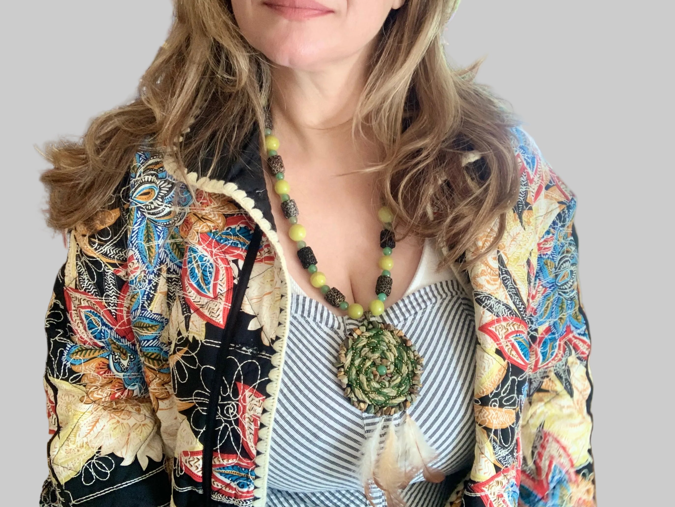 Statement necklace designed for special occasions and creative events. This necklace features a circular centerpiece with green chalcedony and polychrome jasper chips, intertwined with glass seed beads and yarn to create a textured, layered design. Feather accents add movement and visual interest, while a strand of green chalcedony and serpentine completes the overall composition.