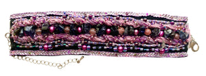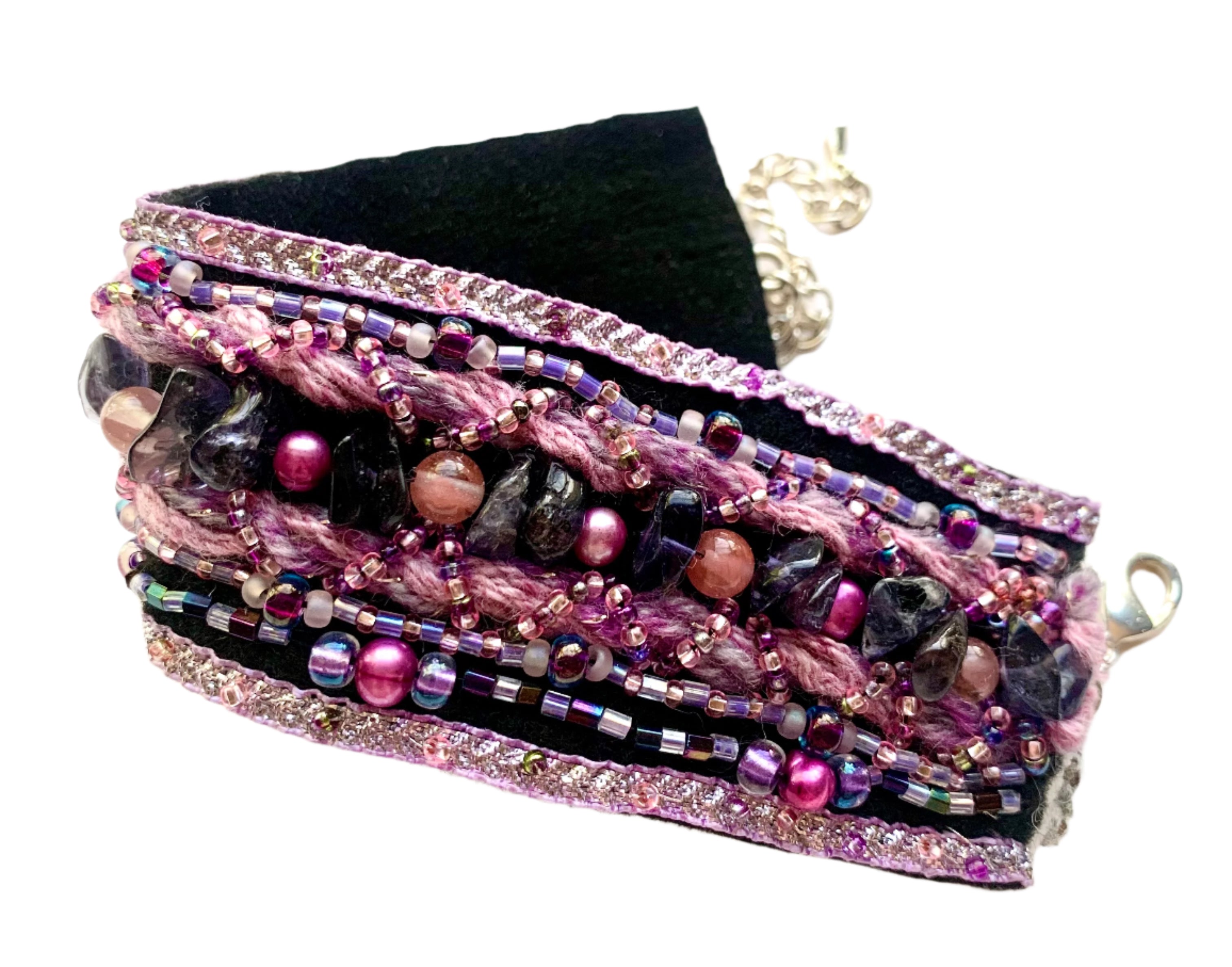 Add burst of colour and joy to your day with this bracelet, a vibrant blend of bright pink pearls, radiant rose quartz, purple Iolite and hand twisted yarn, all sewn onto ultra suede for maximum comfort. Delicate pink ribbon edging adds a festive flair, while the adjustable lobster clasp ensures a perfect fit.