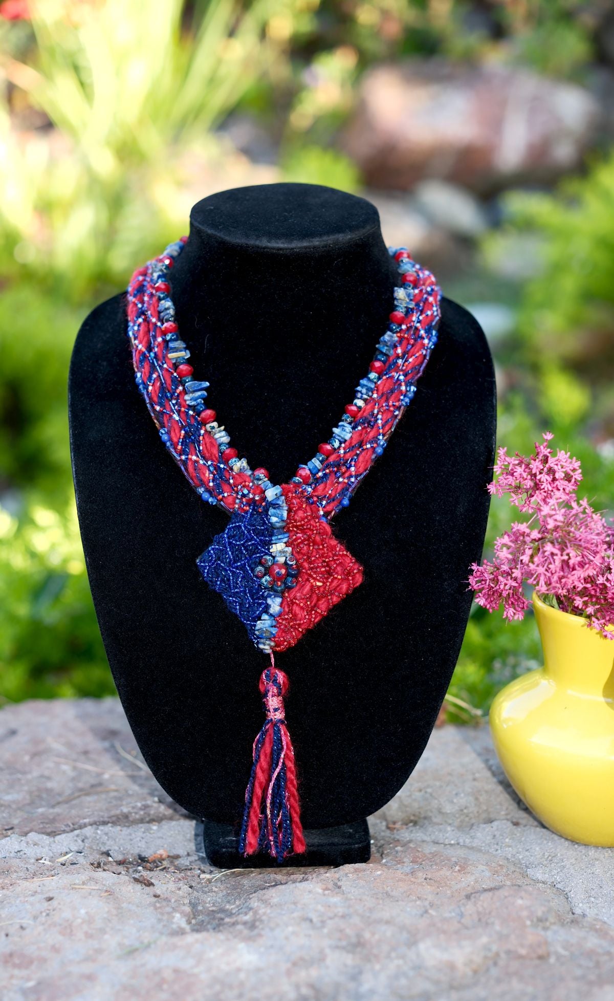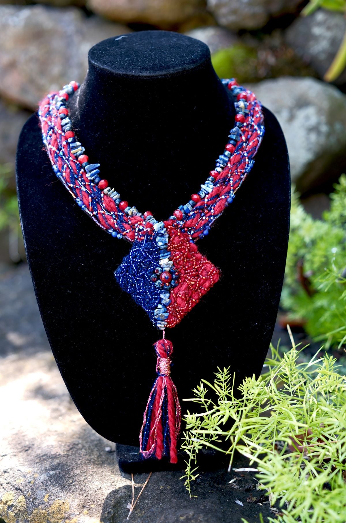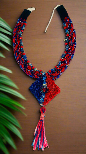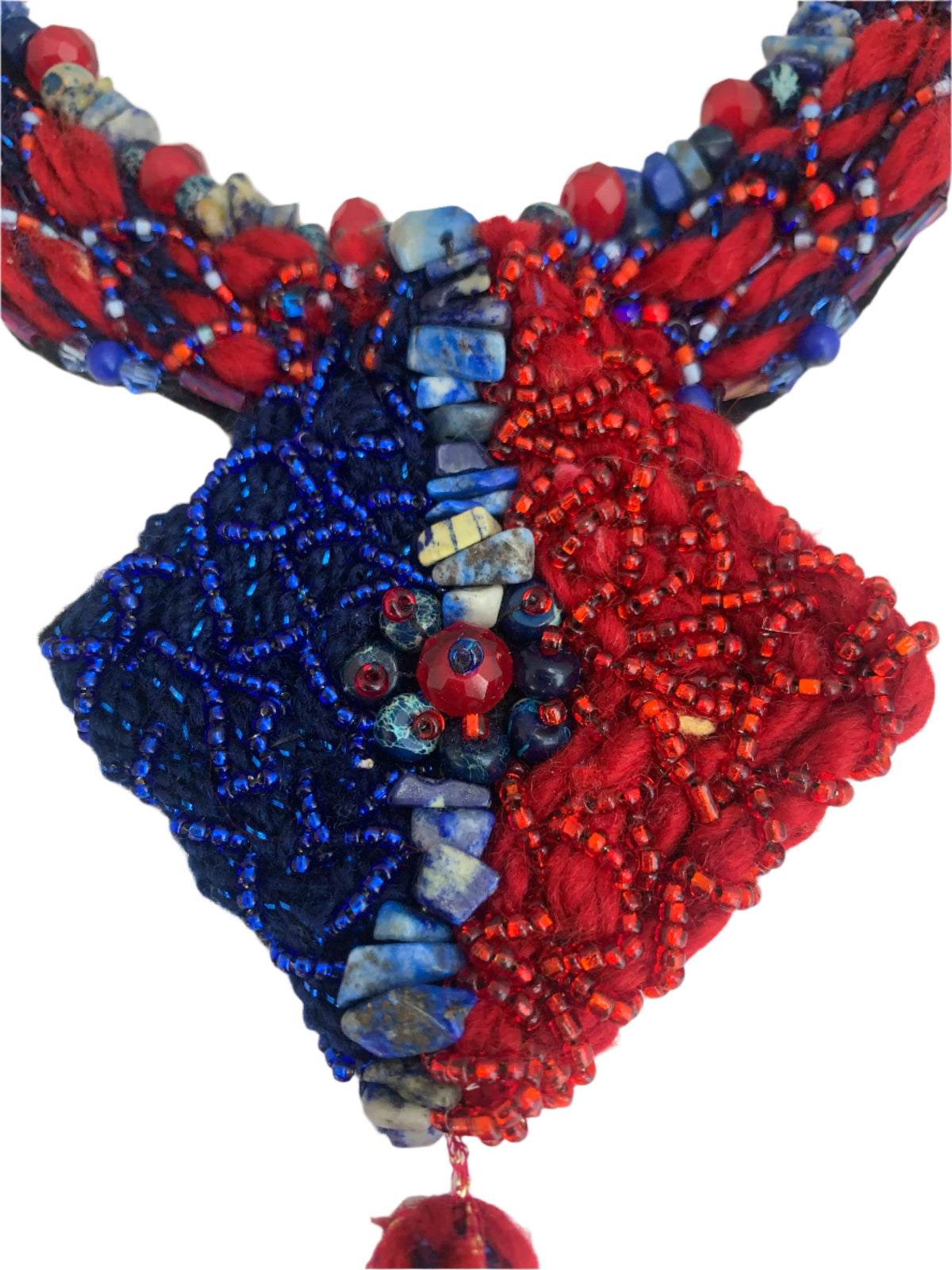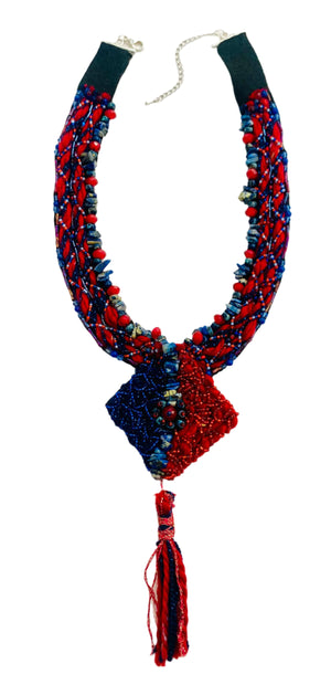 It all started will my fascination for rhombus shape frequently used in Georgian woven tapestries, balanced and full of power. Then came the tassel, which to me it symbolizes movement, flow of energy as we go through life. I knew I wanted a bold contrast, Red quartz for fire and courage, and Blue Lapis for calm and clarity. Bead by bead it became a necklace full of energy, intention and rhythm. A little bohemian, a little regal, just like you.