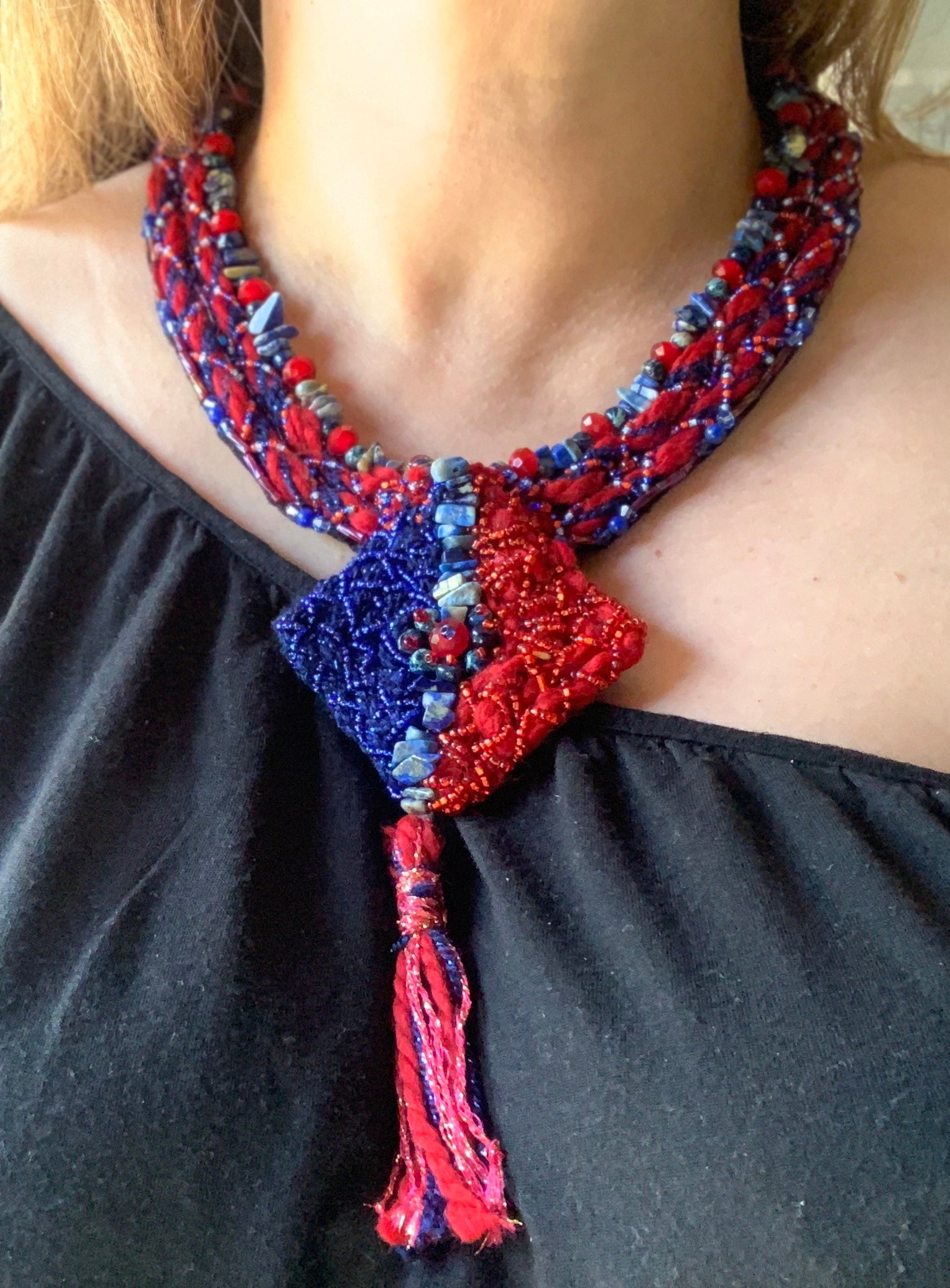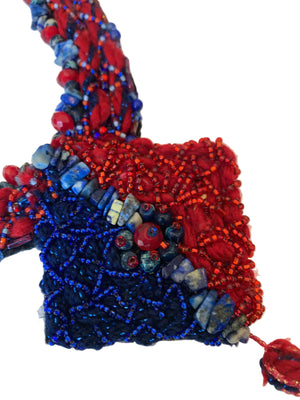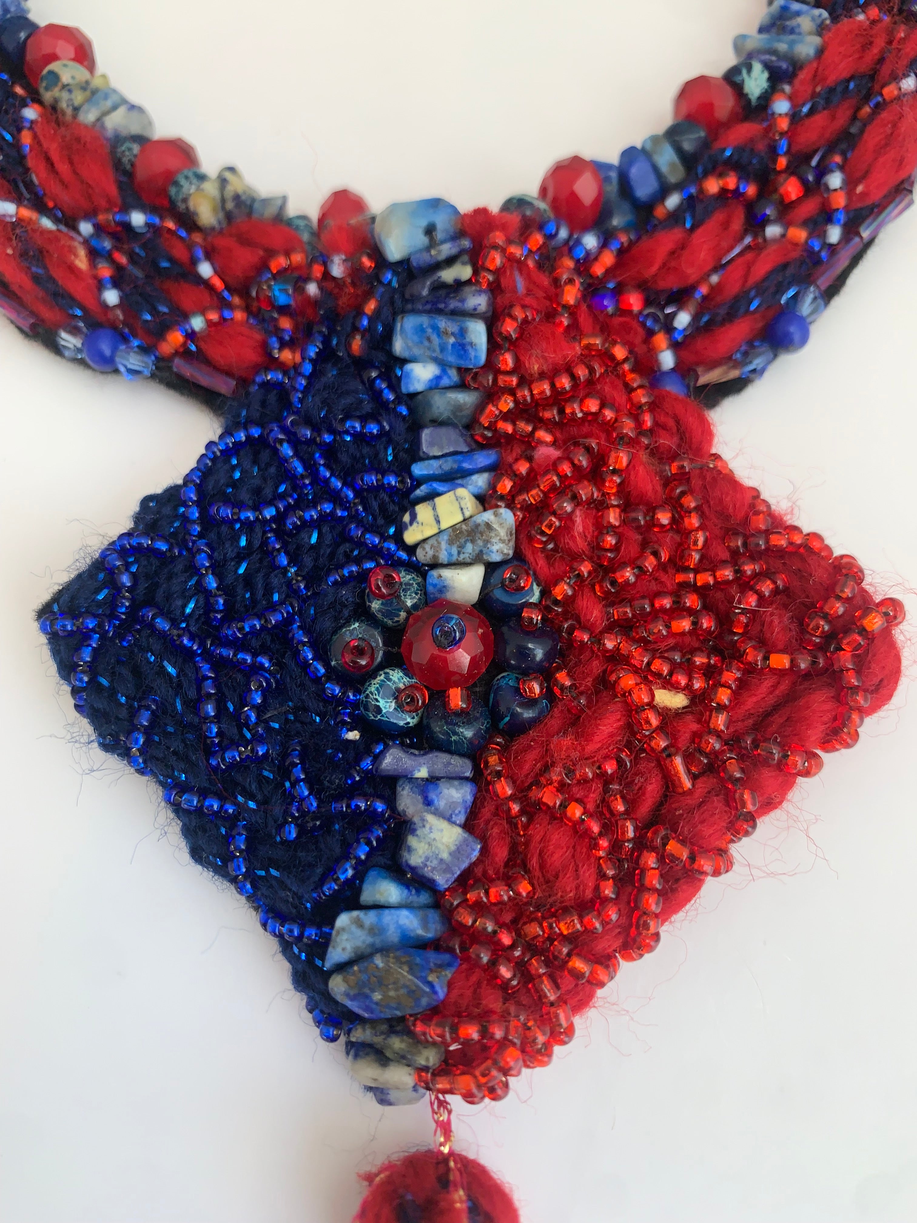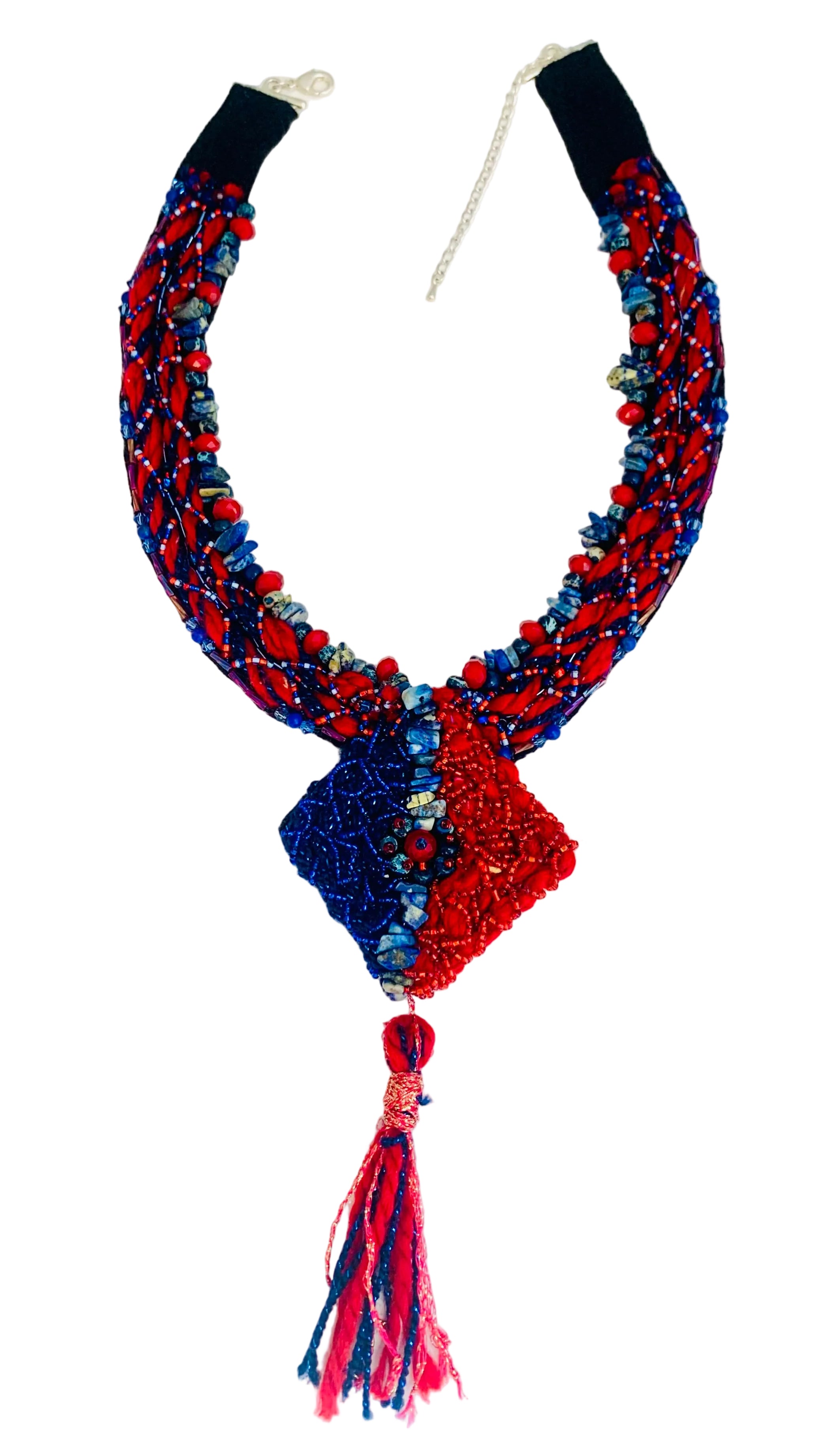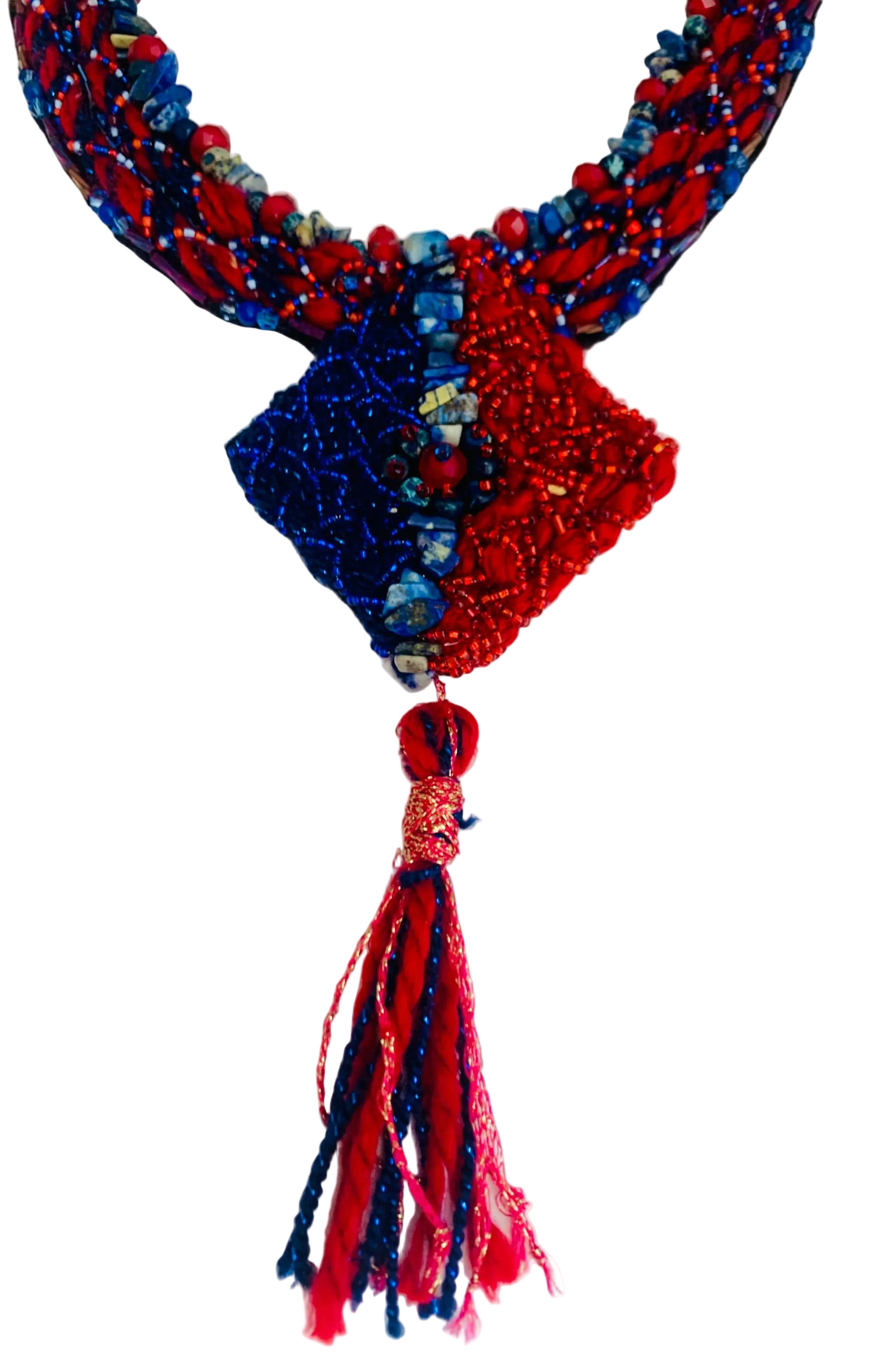 Handmade statement tassel necklace designed for special occasions and evening wear. This necklace features red quartz and lapis lazuli elements arranged in a bold geometric-inspired design with a tassel detail, offering strong color contrast and visual movement while remaining comfortable to wear. Suitable for formal events, gallery openings, cultural gatherings, and creative social occasions.
