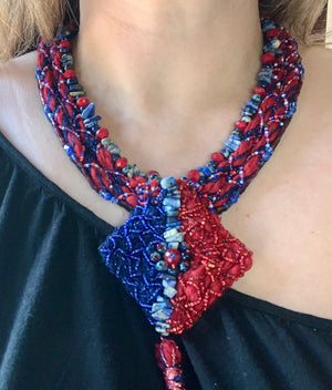 Made as one of a kind with red quartz, lapis lazuli, seed beads and yarn on soft felt. Lobster clasp for Secure closure.