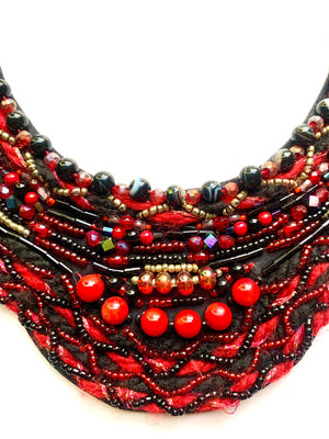 Inspired by the timeless power of red and black, I envisioned a flower blooming in a heart of a confident, creative woman. I chose Black Agate for grounding energy and inner strength, Red Quartz for a bold expression. Hand sewn yarn on flower shaped cotton and seed beads give it a texture, while the crocheted loop with a button offers a final touch.