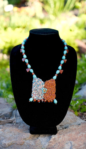 This handcrafted beaded necklace is more than accessory, it's a talisman inspired statement piece designed to captivate. At it's heart lies a striking agate, encircled by turquoise beads that bring balance and protection. The fiery orange and tranquil blue tones form square shape echoing the strength of ancient talismans. I created this necklace to carry both artistry and meaning while offering a modern, one-of-a-kind design.